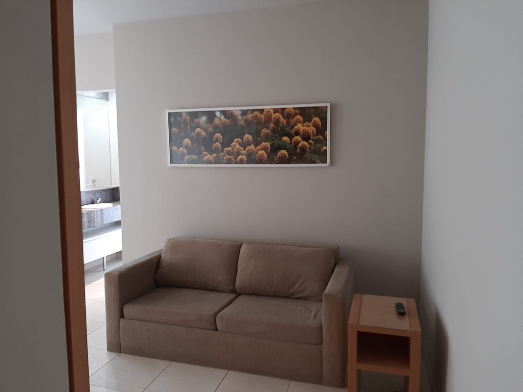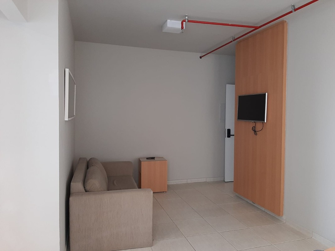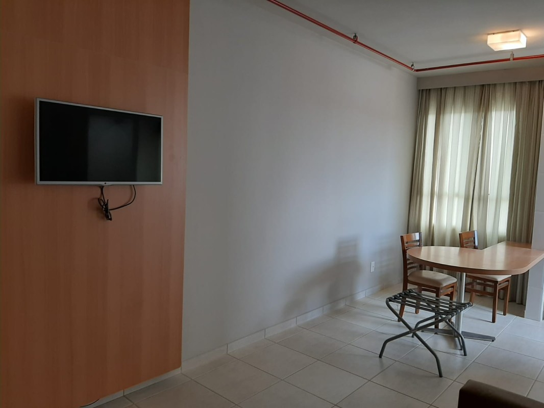 Apto todo mobiliado de 01 Quarto, Sala com sofá, tv e mesa de centro, com Sala, Cozinha com armários, fogão tipo cooktop, frigobar, mesa com cadeiras.