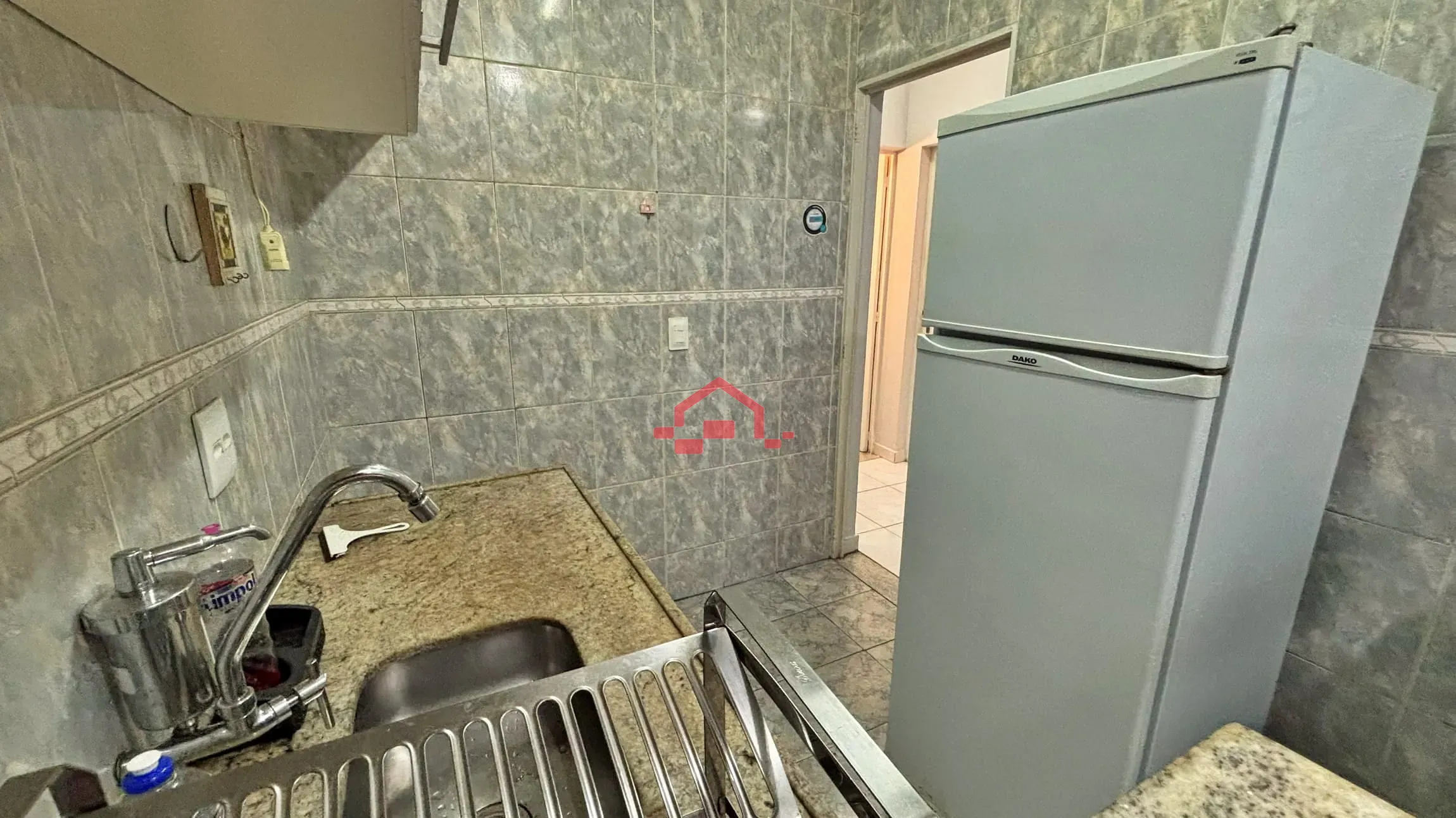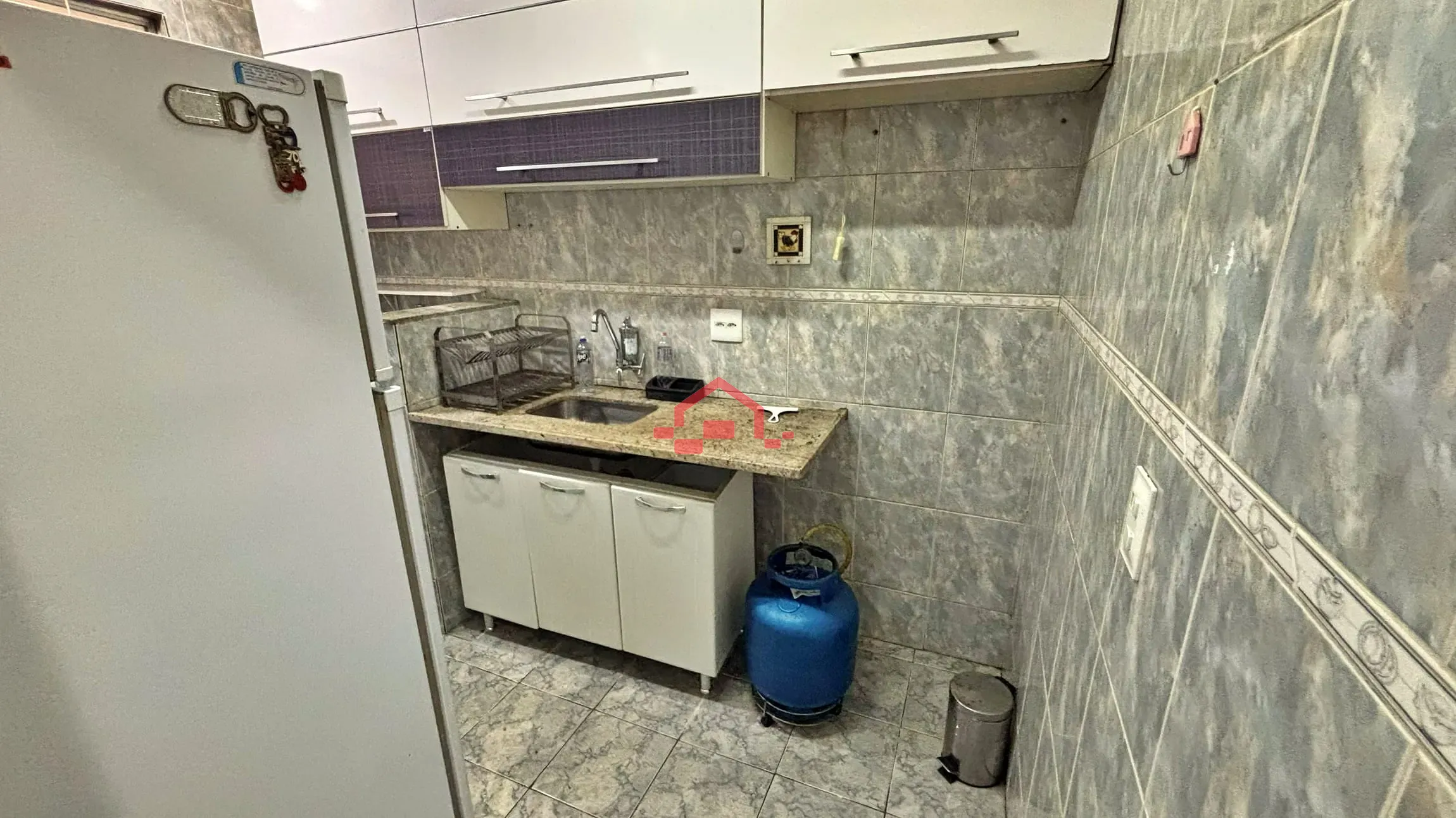 - 01 cozinha com armários, botijão e geladeira.