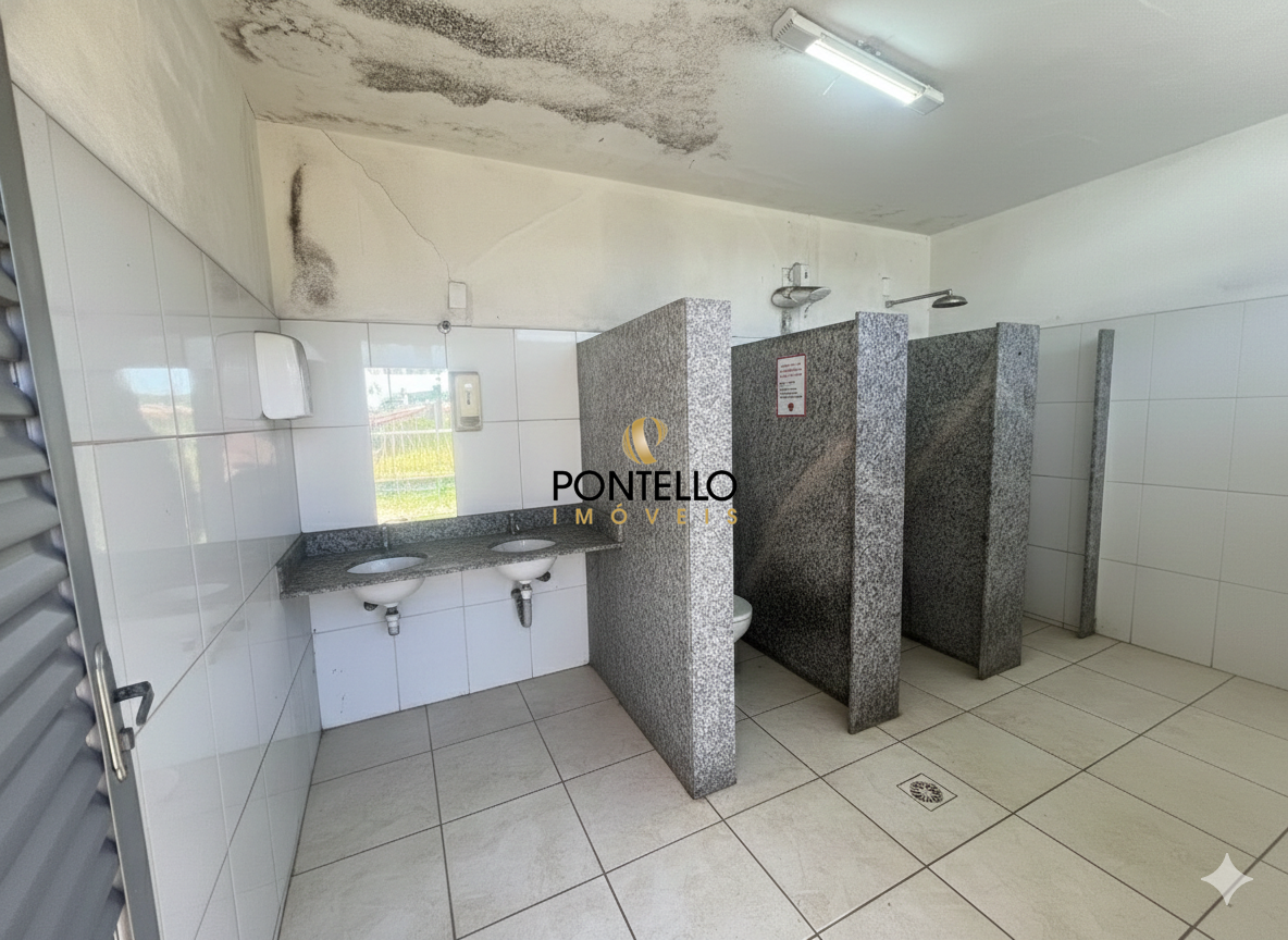 Um lote com uma quadra de areia, com cozinha/bar, banheiro feminino e masculino, ducha, quarto de despejo, possibilidade de fazer um galpão, estacionamento.